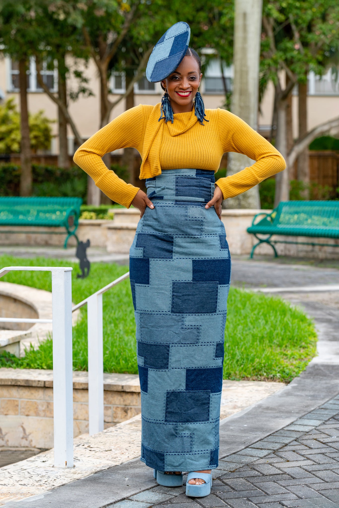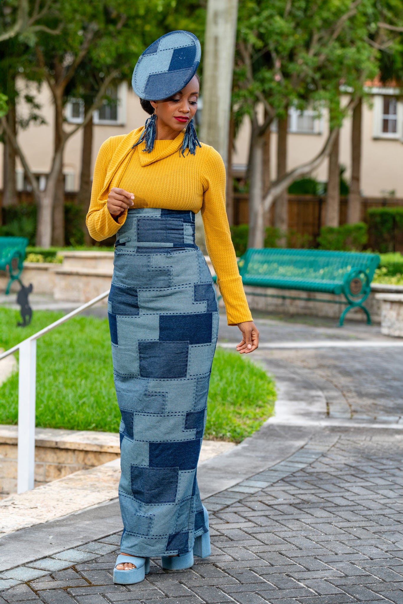 This ankle length high waist denim patchwork skirt is a classy and versatile fit. It is designed with a corset waist to give extra pull at the waistline for a snatched look. The added details at the waistline gives extra flair. You will not be disappointed getting this beauty.