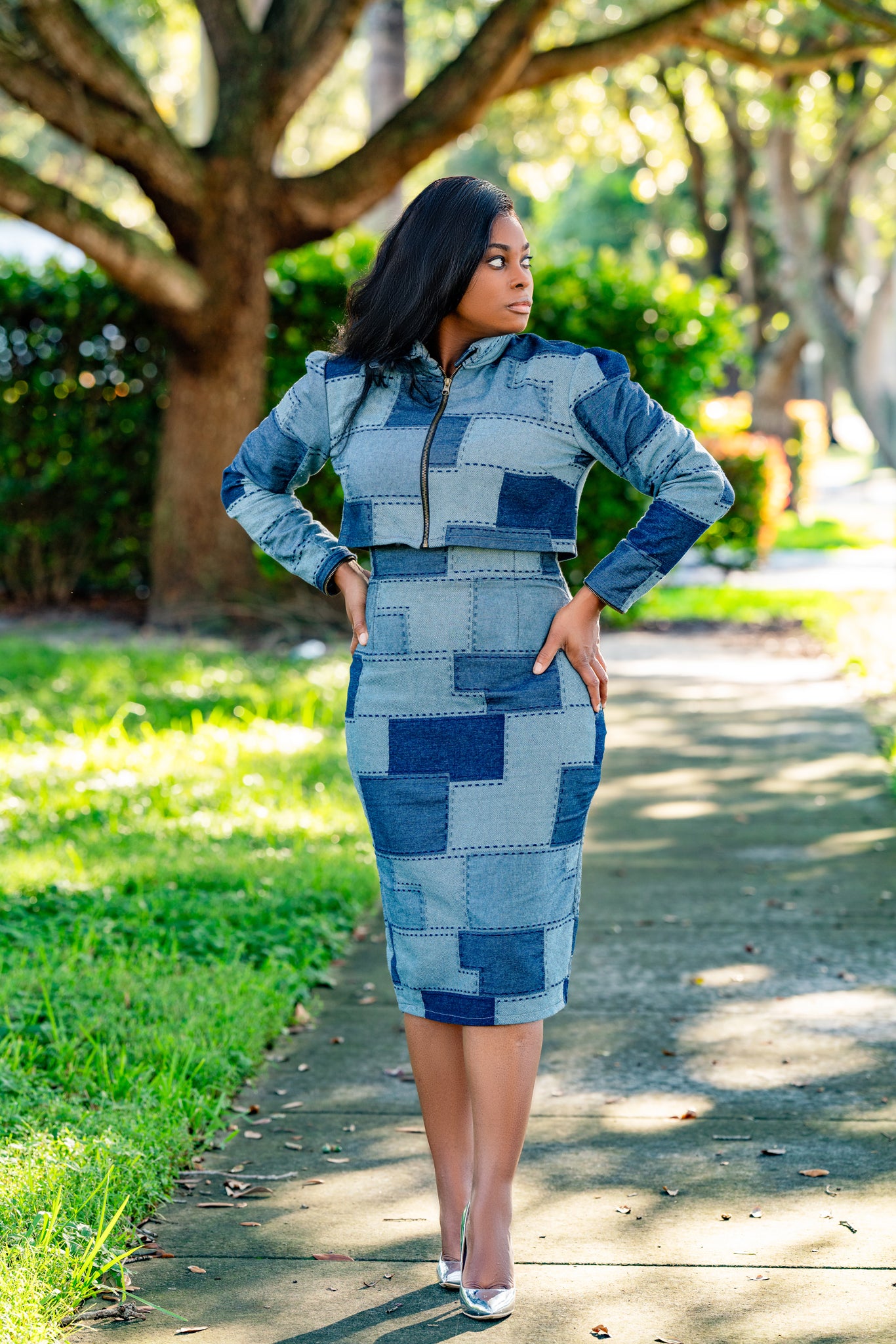 This high waist denim patchwork pencil skirt, paired with a beautifully tailored crop jacket is definitely a classy girl staple. It is very versatile, as it can be worn as a suit or as separates. The added zipper detail at the end of each sleeve gives extra flair.